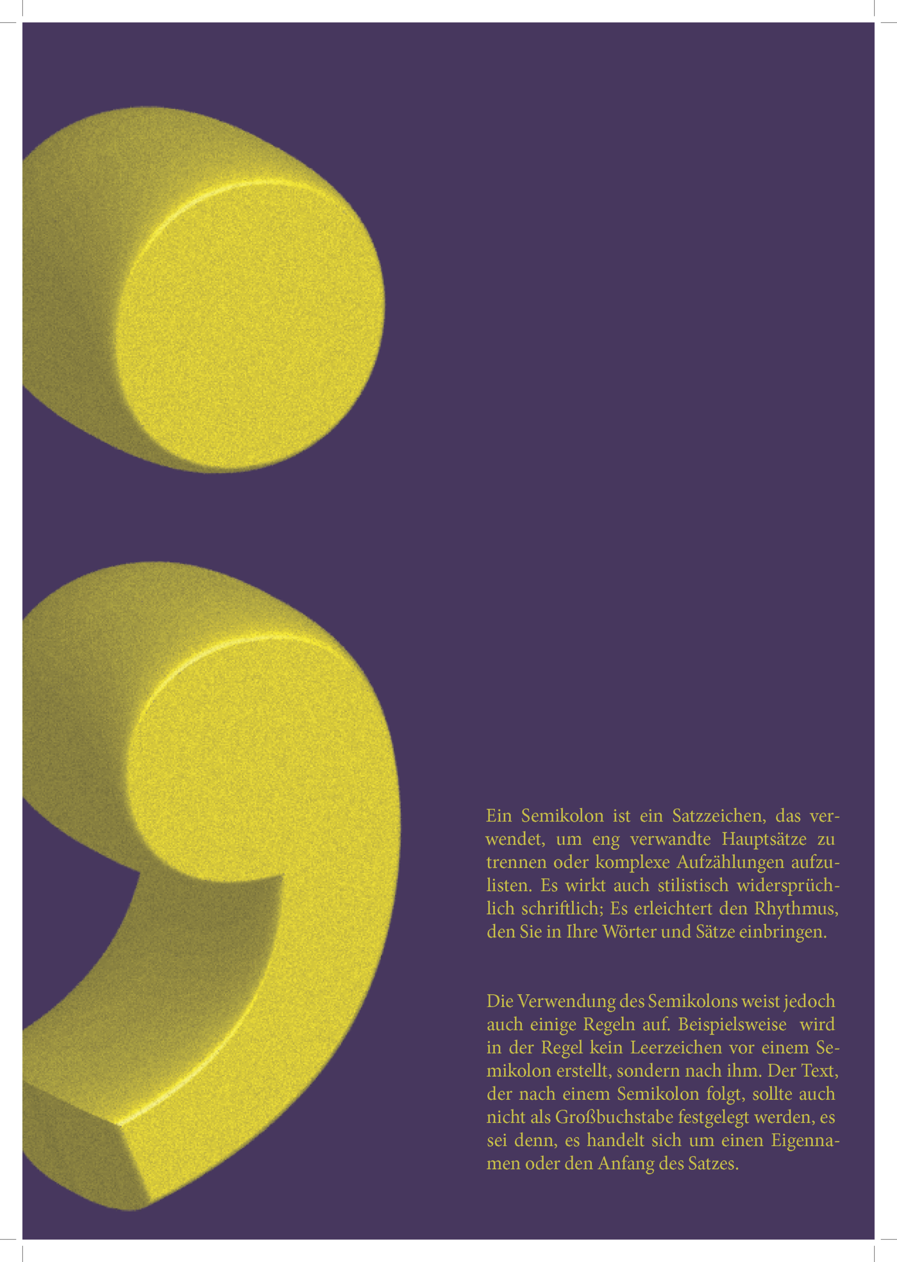 Als Gestaltungsprinzip wählten wir Kontrast. Das Semikolon selbst symbolisiert bereits Gegensätze, weshalb dieses Prinzip besonders gut passte. Der starke Grössenunterschied zwischen dem dominanten Semikolon und dem ruhig gesetzten Textblock verdeutlicht diesen Gegensatz zusätzlich.